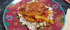 This is my take on the classic Italian/American favorite, Chicken Cacciatore. Chicken braised in red wine with bell peppers, onions and plum tomatoes.