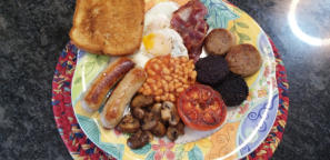 A traditional Full English Breakfast is a substantial meal consisting of sausage, bacon, black