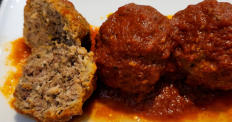 2 lbs. Ground beef (See comments)2 lbs. Ground pork (See comments)8 slices Italian bread, broken into small pieces½ cup whole milk2 tablespoons freeze dried parsley or ½ cup chopped fresh parsley2-4 teaspoon Kosher salt, or to taste (I use 4 teaspoons)1-2 teaspoons black pepper, ot to taste (I use 1 teaspoons)¼ cup dried Oregano1 tablespoon dried Basil1 ½ cups grated Romano or Parmigiano cheese (I always use Romano for meatballs).4 large eggs, slightly beaten¼ cup extra virgin Olive OilYou will also need 12-16 cups of red sauce.
