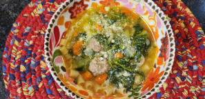 Tender meatballs, carrots, celery, onions and your favorite greens with a little pasta in a
