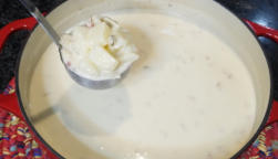 You will need a minimum of 1⅔ cups of cooked clams (I used about 2¼ cups). If you are using canned clams use chopped or a combination of chopped and minced (Reserve the juice from the cans and use toward the 7½ cups of liquid. If you are using fresh clams you will need 4 pounds of little clams, cooked and chopped. If you want more of an ocean taste other then the traditional taste, you can substitude seafood stock for the fish stock.