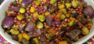 Roasted Brussel Sprots, Butternut Squash, Red Onions with pomegranate sauce