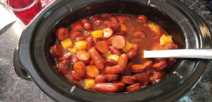 kielbasa and the sausage links and stir until coated. Cover and cook on high for 3 hours. Stir