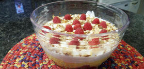 raspberries and gently pour the warm pudding over the raspberries and biscuits, cover with