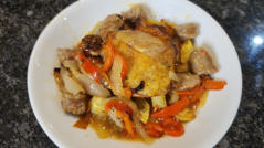 AKA Chicken & Sausage. Braised chicken, Italian Sausage, peppers & onions in a sweet and tangy pan sauce.