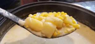 in the chicken stock until smooth and bring to a boil. Add in the potatoes, corn, Accent, salt