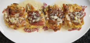 Chicken wrapped with bacon and dried beef, smothered in sour cream and condensed cream